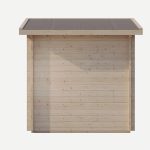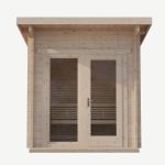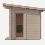 Sauna jest jasna i przytulna dzięki dużym przeszkleniom oraz boazerii z jasnego drewna. Zapewnia komfortowe warunki dla dwóch osób, jednocześnie zachowując kompaktowe wymiary. Jej modułowa konstrukcja pozwala na szybki i prosty montaż samodzielny – wszystkie elementy są dokładnie przycięte i dostarczane w zestawie na jednej palecie. Wystarczy złożyć elementy, zamontować piec (elektryczny lub tradycyjny, opalany drewnem) i – jeśli chcesz – wykończyć saunę od zewnątrz według własnego gustu.