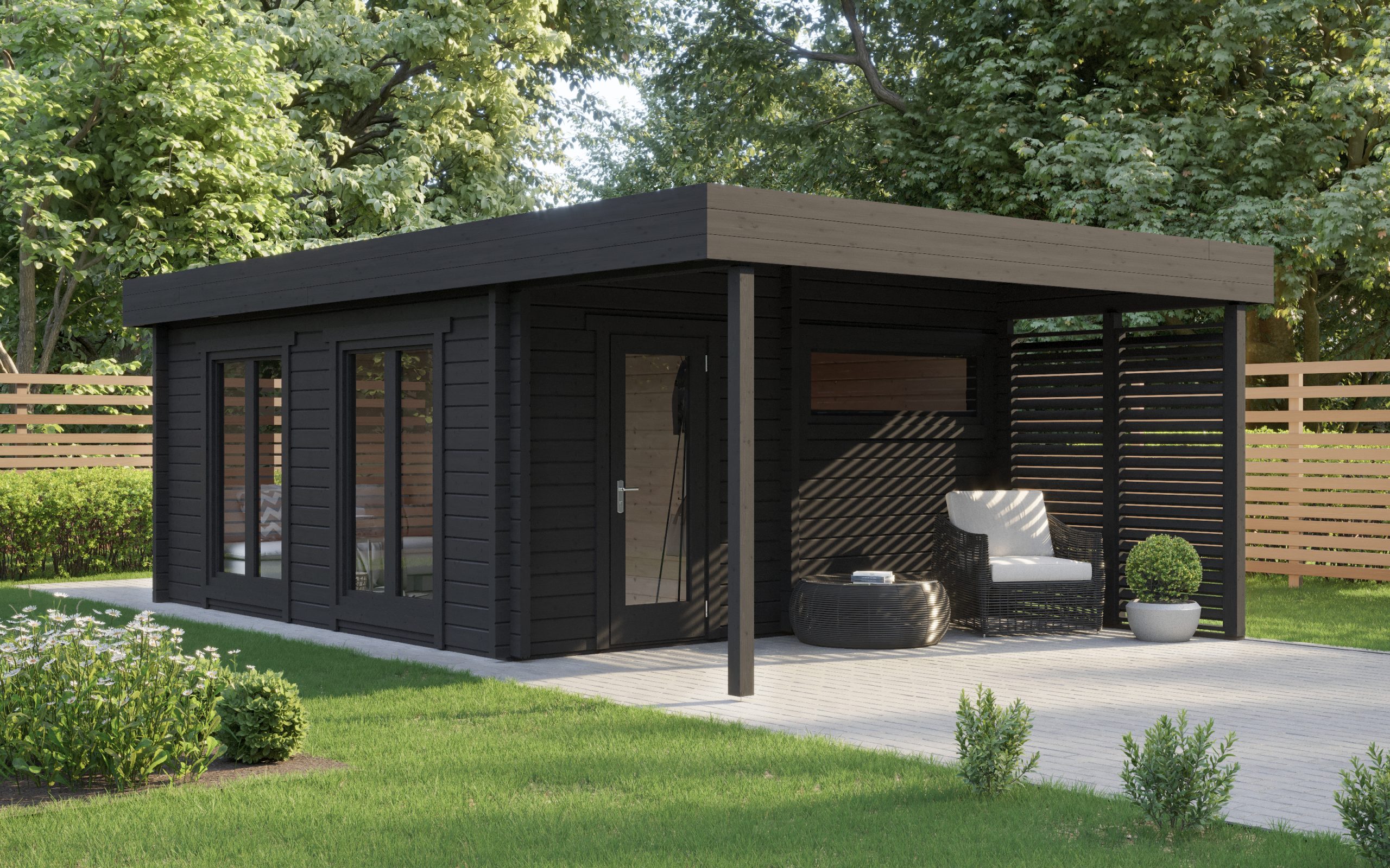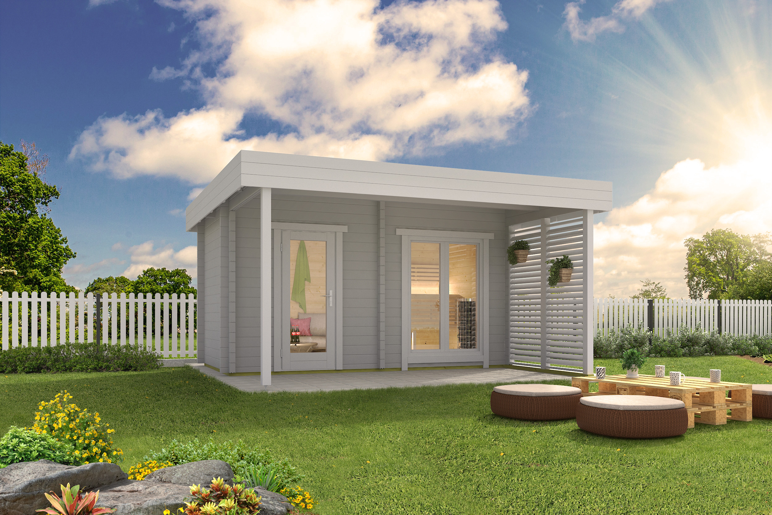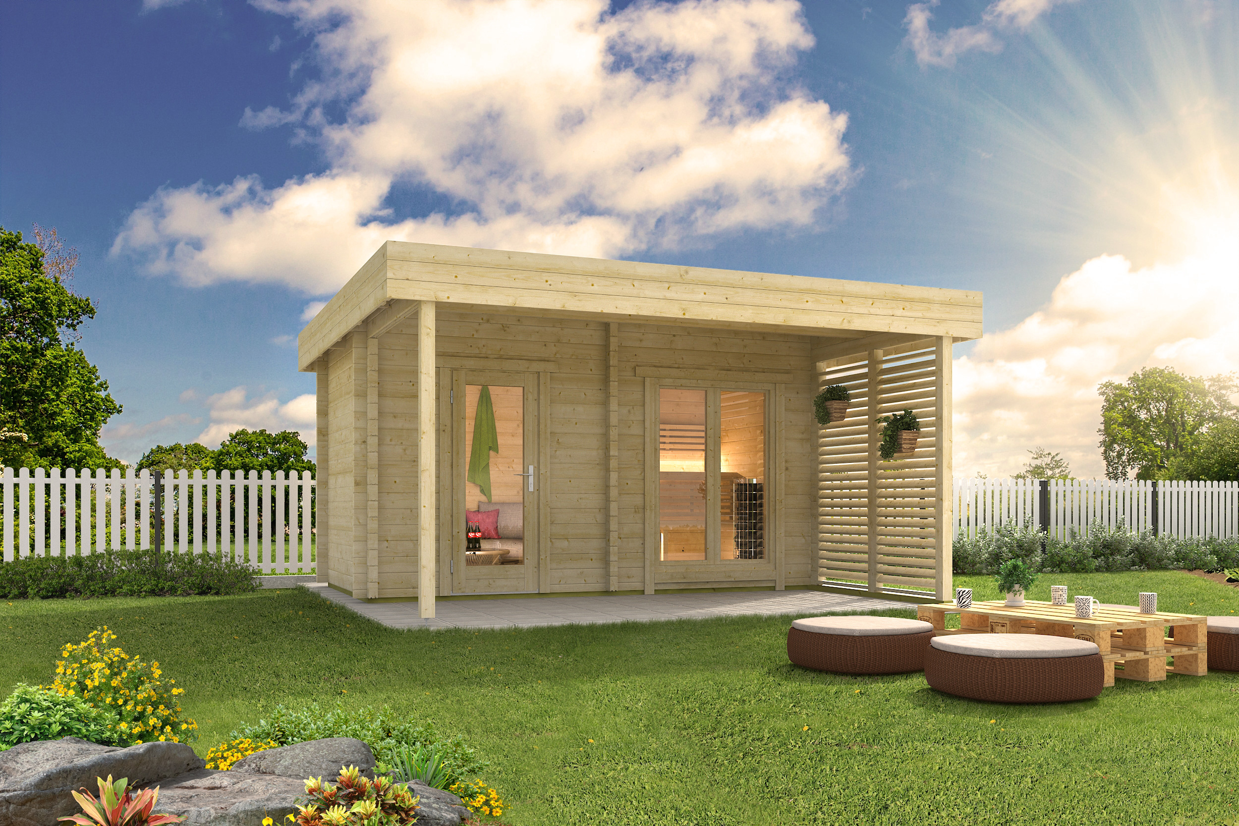 Zadaszenie pozwala na relaks na świeżym powietrzu niezależnie od pogody – zarówno po seansie w saunie, jak i podczas spotkań towarzyskich czy spokojnego wypoczynku w ogrodzie.