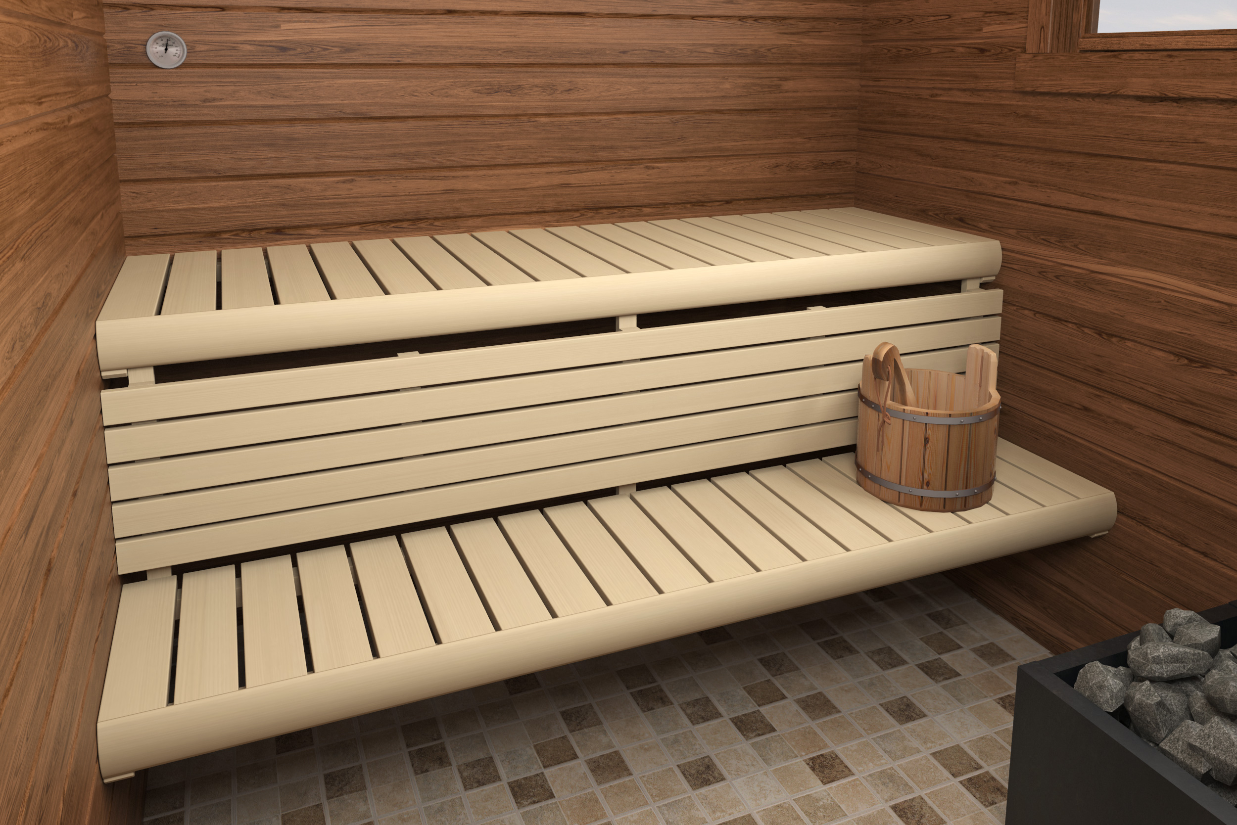Wnętrze sauny Magnus zostało zaprojektowane z myślą o wygodnym saunowaniu w pozycji siedzącej i półleżącej. Odpowiednie proporcje kabiny zapewniają równomierne nagrzewanie oraz efektywną pracę pieca – zarówno elektrycznego, jak i opalanego drewnem. Przestrzeń pozwala na komfortowe korzystanie z sauny przez kilka osób jednocześnie.